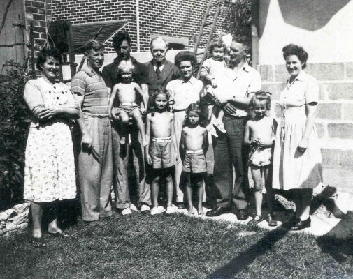 | Noel Robinson, Grandpa Boyd, Robert, Auntie Mac (?) (holding Patricia?) at back, Ann, Molly (holding Judy Mary) and Peggy at front, May 1943 |