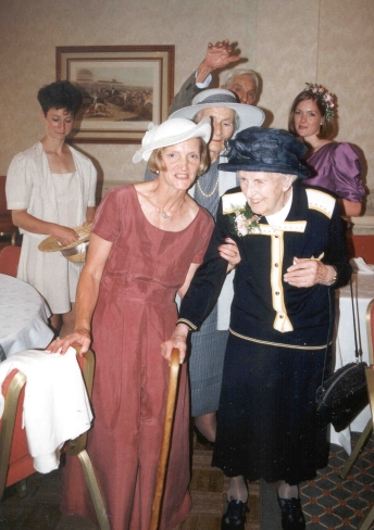 Auntie Mac at Rachel's wedding, with Lesley, Alice, Noel (waving), Ivy and Pippa (bridesmaid), 1995 |