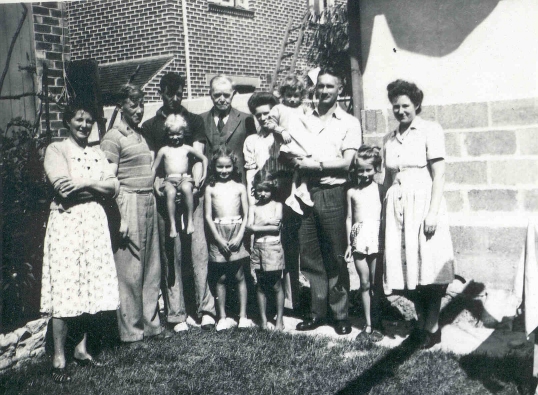 | Noel Robinson, Grandpa Boyd, Robert, Auntie Mac (?) (holding Patricia?) at back, Ann, Molly (holding Judy Mary) and Peggy at front, May 1943 |