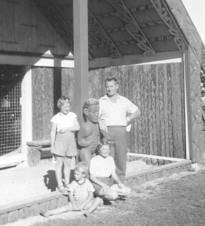 Robert Boyd with Susan, John and Jennifer Morrison outside War Canoe House, Waitangi, New Zealand, March 1957 |