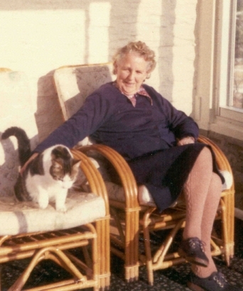 Auntie Mac at Fron Llwyd with Tibby the cat (probably aged 70 to 75) |