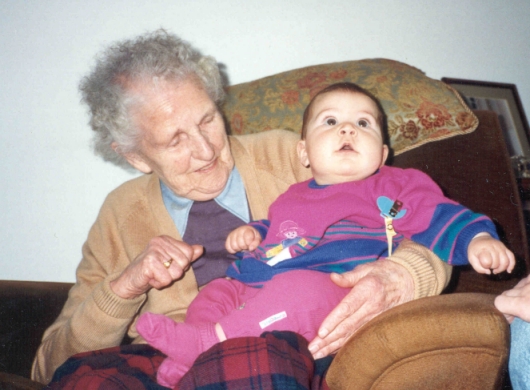 | Auntie Mac with Angharad Pitty, April 1992. Auntie Mac aged 89 and Angharad aged 6 months |