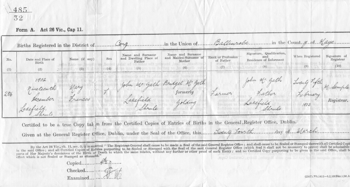 | Birth certificate of Mary Frances McGath |